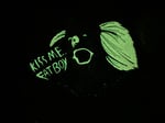 2.5” wide soft enamel pin with red and yellow glow in the dark enamel and double backing posts.